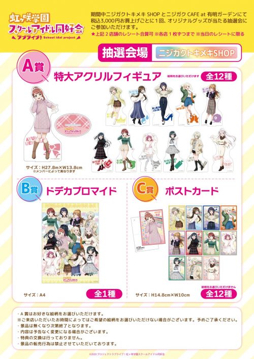 ニジガクトキメキSHOP先⾏商品に、新規描き下ろしイラストのグッズが多数登場!!さらに、ニジガクトキメキSHOPとニジガクCAFEのお買上げレシ ートで参加できるガラポン抽選会のアイテムも一新!!