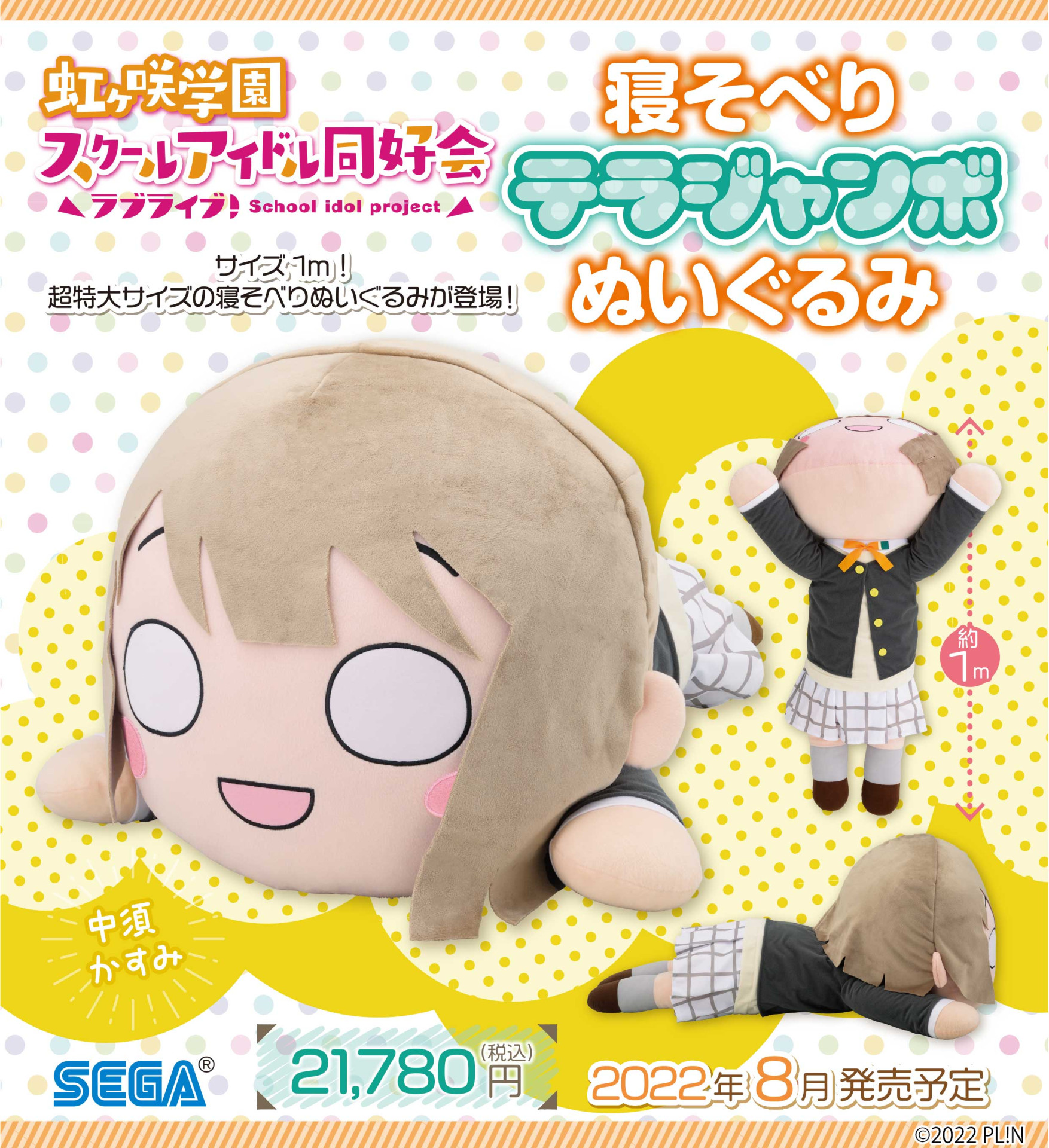 「ラブライブ!虹ヶ咲学園スクールアイドル同好会」から、“中須かすみ”が超特大サイズの寝そべりぬいぐるみになって登場します。迫力満点の全長約1mサイズになっています。本日、3月22日より各種ECサイトにて予約受付開始です。