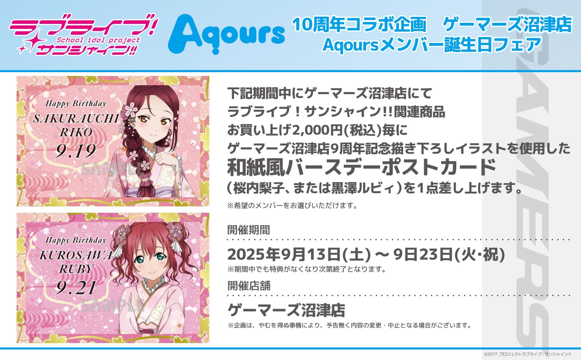 ゲーマーズ沼津店より、「ラブライブ!サンシャイン!!」Aqours10周年コラボ企画 ゲーマーズ沼津店Aqoursメンバー誕生日フェア9月開催のお知らせ
